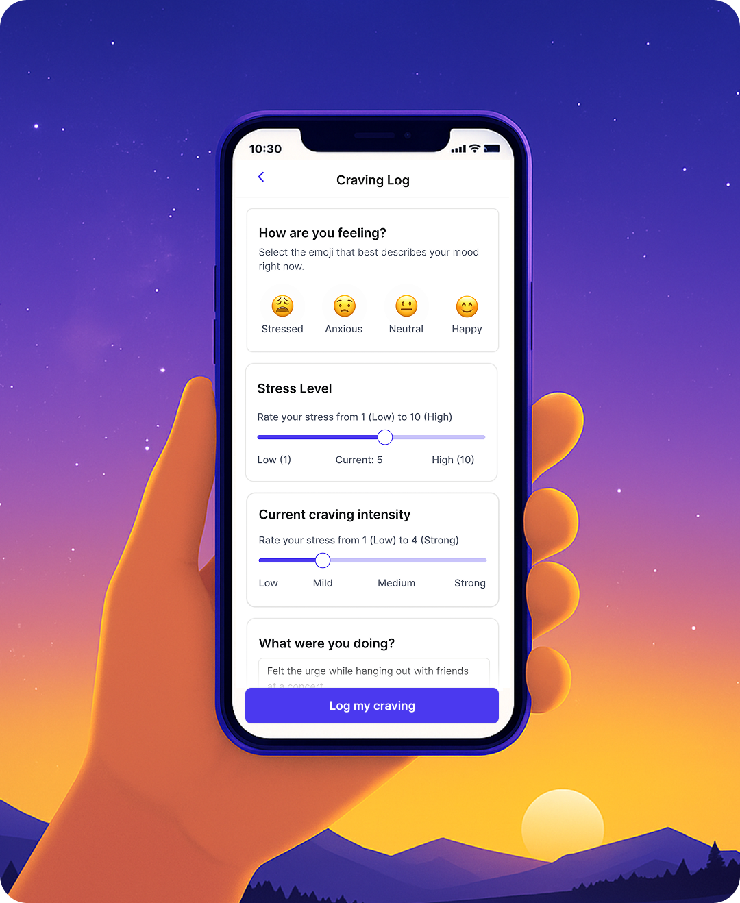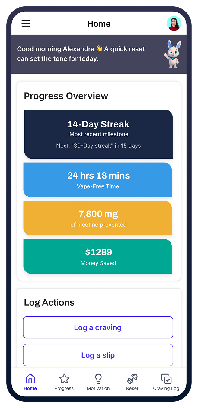 Capture cravings, stress, and triggers as they happen so you can understand your vaping urges and respond with intension.
