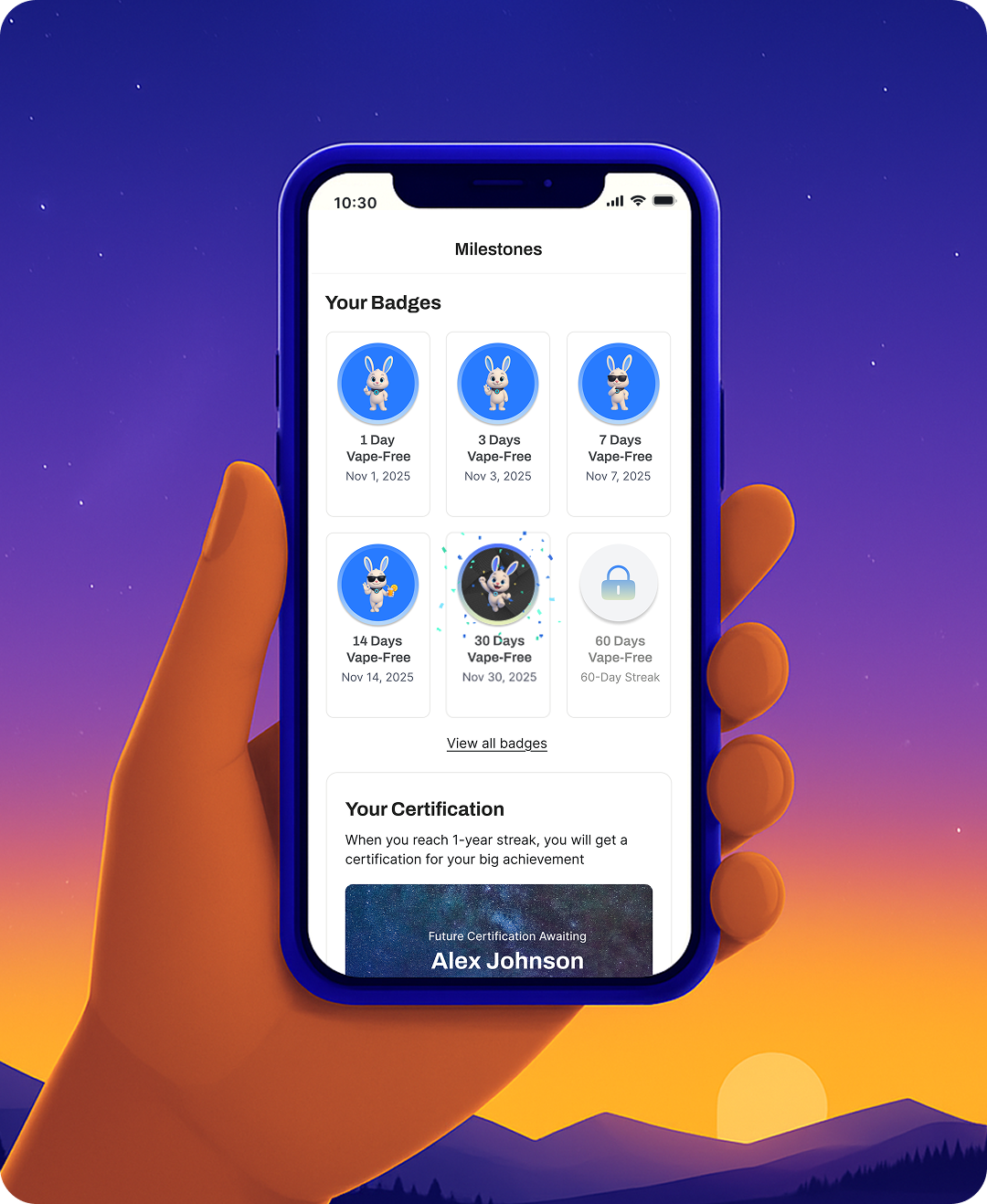 Unlock unique badges as you hit milestones, each one honoring your courage and charting your inspiring vape-free success story.